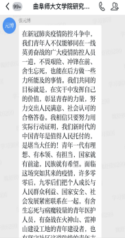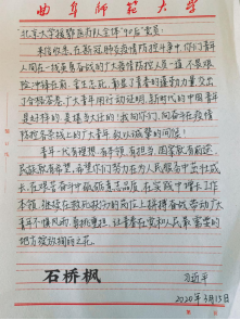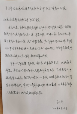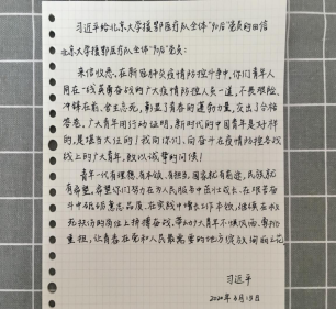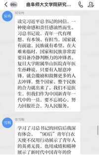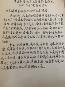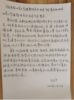 习近平总书记在给北京大学援鄂医疗队全体90后党员的回信中指出,“在新冠肺炎疫情防控斗争中,你们青年人同在一线英勇奋战的广大疫情防控人员一道,不畏艰险、冲锋在前、舍生忘死,彰显了青春的蓬勃力量,交出了合格答卷。广大青年用行动证明,新时代的中国青年是好样的,是堪当大任的!”危难时刻,方显英雄本色,在祖国最需要的时候,数以万计的90后、00后“白衣天使”奔赴前线。同为90后的我们,应该像他们一样奉献,勇敢承担重任,坚定前行。