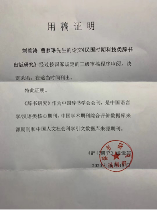 曹梦琳于大一下学期加入应用语言学教研室刘善涛老师的国家社科基金项目,她利用课余时间查阅大量参考文献和相关资料,明确论文写作方向,克服语言粗糙、表述不规范等困难,不断对作品进行修改和完善,历时两年,终于在2020年初完成《民国时期科技类辞书出版研究》的定稿,并被《辞书研究》所采用。