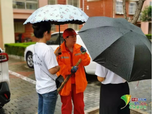 图为队员采访社区清洁工人