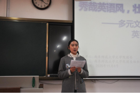 为激发同学们的英语学习热情,提高英语水平和演讲能力,让蜘蛛直播 学子在多元文明碰撞中,传递中国话语,增强爱国意识,培养国际化人才,11月8日,由蜘蛛体育直播官网 团委主办、蜘蛛直播 团委组织部承办的“秀哉英语风,壮兮少年志——多元文明唱响时代华章”英语演讲比赛在文史楼412教室成功举办。本次活动面向蜘蛛直播 19级、20级全体同学,邀请18级杨庆卿、荆凡彩,教育蜘蛛直播 19级康晓璇三位具有丰富英语演讲比赛经验的优秀学生担任评委。蜘蛛直播 20级学生李一婷主持本次比赛。