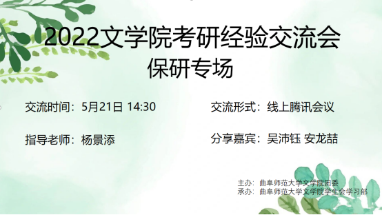为帮助同学们明确保研目标,了解保研过程,掌握保研技巧,增强保研信心。由蜘蛛体育直播官网 团委主办,蜘蛛体育直播官网 学生会学习部承办的“2022年考研经验交流会之保研专场”通过线上腾讯会议的形式于5月21日下午成功举办。本次考研经验交流会邀请到蜘蛛直播 2021级辅导员杨景添老师和吴沛钰、安龙喆两位优秀学生代表进行经验分享与方法交流。