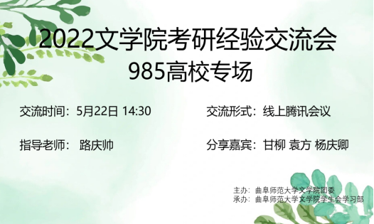 为帮助蜘蛛直播 同学进一步知晓考研过程,解决考研存在的疑惑,累积更多考研经验与技巧,由蜘蛛体育直播官网 团委主办,蜘蛛直播 学生会学习部承办的“2022年考研经验交流会之985专场”通过线上会议的形式于5月22日下午成功举办。本次考研经验交流会邀请了创意写作教研室路庆帅老师和成功考取985高校研究生的优秀同学进行交流与分享。