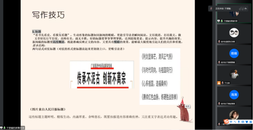 活动伊始,主持人胡雅晴宣读开场词。随后,秘书处主讲人于楚璇讲解工作总结和工作计划的要求、写作技巧以及各种易错难点,重点讲解了有关策划书和新闻稿撰写的内容和相应格式要求,并对公文写作中出现的常见问题进行纠正。本次活动还设置了疑难问题解答等互动环节,参会的同学们踊跃提问,主讲人耐心回答问题,形成了相互促进的良好氛围。