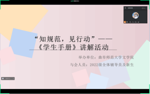 为进一步加强2022级新生对《学生手册》的认识与了解,帮助新生明确未来目标与发展方向,更好地规划大学生活,9月29日,蜘蛛直播 成功举办线上新生手册讲解活动。2022级全体辅导员及新生参加会议。