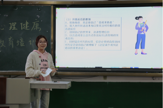 活动过程中,高原老师组织同学们进行互动测试。通过测试,高原老师了解到了同学们对心理健康知识的了解程度。同时,高原老师向同学们阐述了心理委员和心理信息员的角色定位,加深了同学们对自己的身份定位和工作认知的理解。