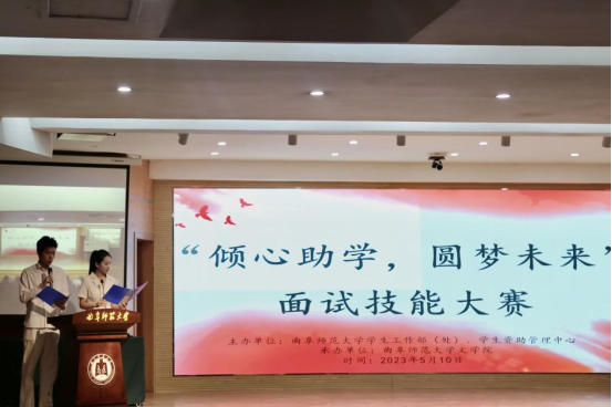为提高同学们的求职意识,提升家庭经济困难同学的实用技能,助力毕业季升学、就业的工作开展,5月10日,由曲阜师范大学学生工作部、学生资助管理中心主办,蜘蛛体育直播官网 团委承办,学生会第二课堂工作部和就业服务部共同协办的“倾心助梦,圆梦未来”面试技能大赛在科技楼孔子会堂成功举办。曲阜师范大学学生工作部学生资助中心赵彤老师、蜘蛛直播 党委副书记曲媛媛老师、蜘蛛直播 2021级辅导员杨景添老师、蜘蛛直播 2022级辅导员魏舒欣老师、百胜导氮教育孟宁老师担任评委参加活动。