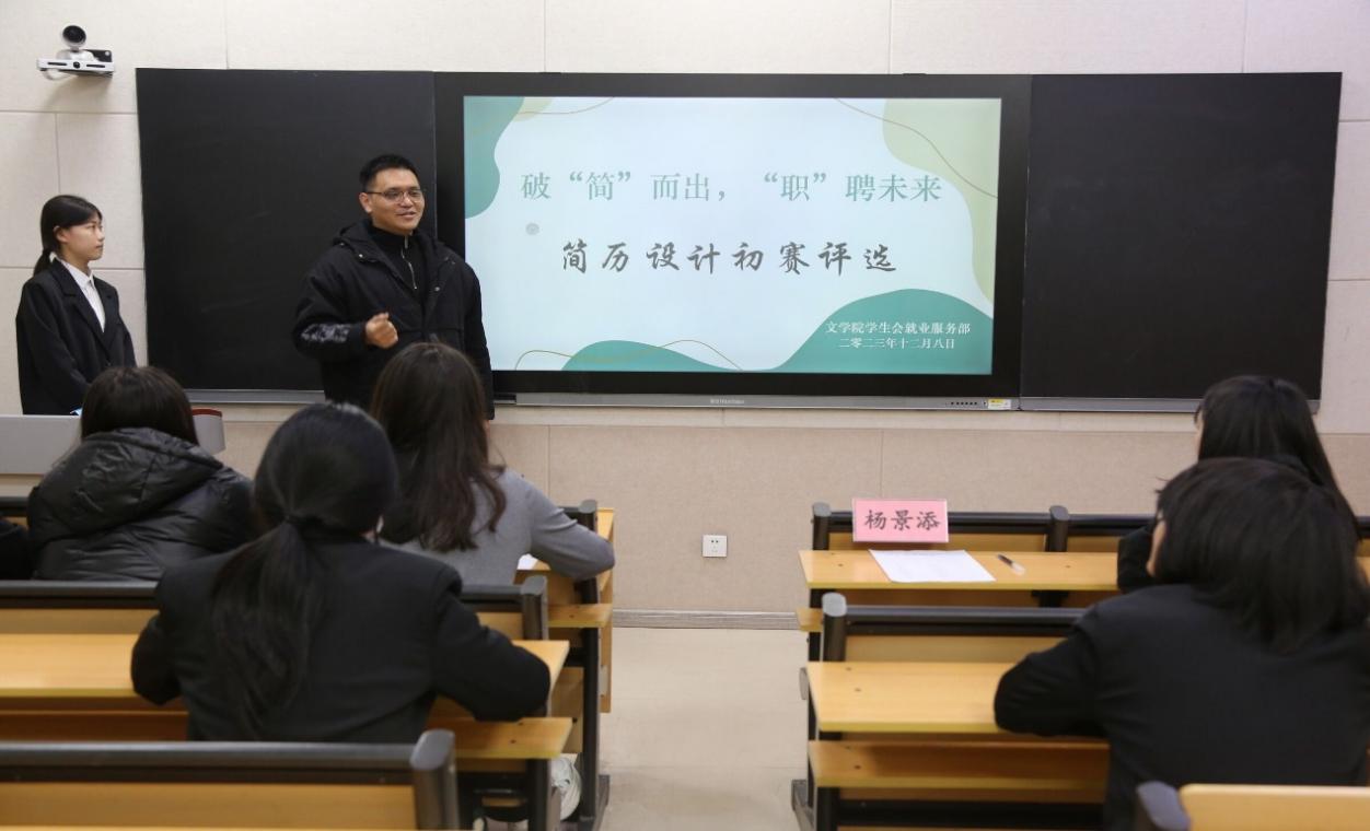 为帮助蜘蛛直播 学子了解必要的就业知识,提高自身的就业技能,由蜘蛛直播 团委主办,就业服务部承办的“破‘简’而出,‘职’聘未来”简历设计大赛初赛于12月8日在老文史楼111教室顺利举办,决赛于12月10日在文史楼410教室成功举办。蜘蛛直播 就业辅导员杨景添老师及部分学生会部长担任本次评委。