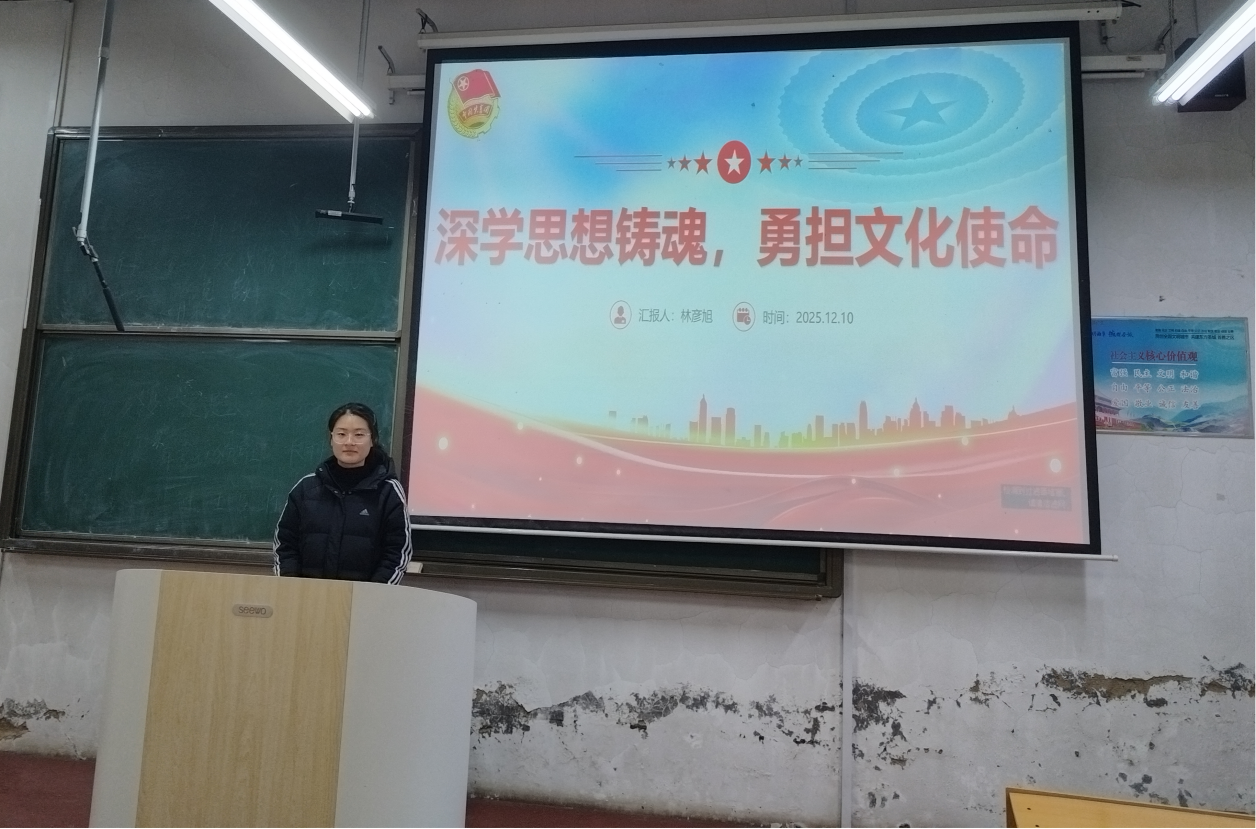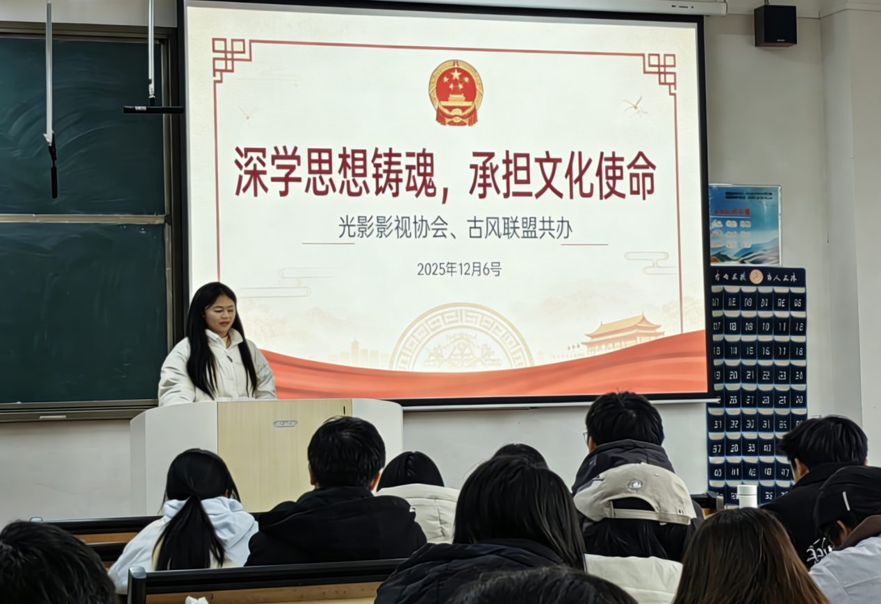 各团支部通过系统化、多层次的理论学习活动,引导青年学子深学细悟习近平文化思想。2024级1班、2班,2025级2班团支部以及光影影视协会、古风联盟社团开展主题班会宣讲,围绕习近平文化思想的核心要义进行系统讲解与专题解读;2024级8班、2025级1班团支部开展了习近平文化思想相关名词的讲解活动,并在此基础上结合专业特色进行延伸解读,引导同学们深化对习近平文化思想科学体系与实践要求的理解。
