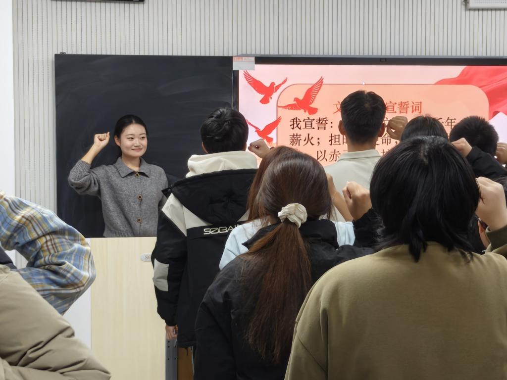 为促进思想认知向实践行动的有效转化,各团支部积极创新实践形式,开展系列主题活动。2025级8班团支部创新推出“文化使命践行卡”活动,同学们结合自身成长轨迹与学科专业特点,将文化体悟转化为清晰的行动指南;2025级7班团支部通过组织庄严的集体宣誓仪式,帮助同学们将内心感悟转化为矢志践行的精神动力,完成从思想认同到行动自觉的关键一步。