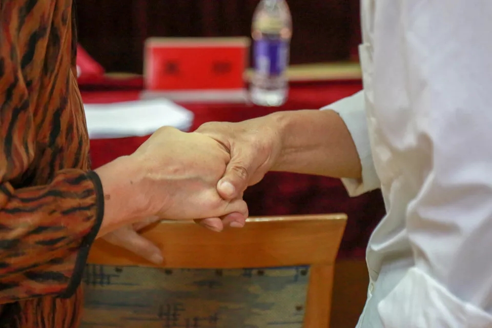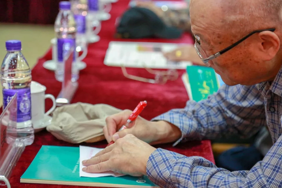蜘蛛直播 的学生饱含深情的朗诵了《甲子梦.曲园情》及由原曲阜师范大学党委副书记张顺清先生创作的诗词《满江红》。58级校友和大学生合唱团共同高唱歌曲《团结就是力量》。随后2018级的学生为1958级的学生佩戴校徽,并由王继锁为58级同学代表颁发入学登记表。会后,与会人员到科技实验大楼前合影留念,随后返回会议室畅所欲言。