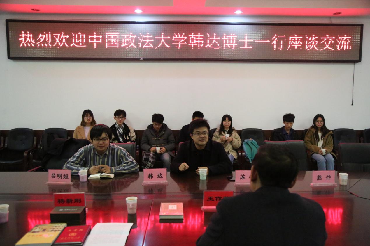 11月18日上午,中国政法大学人蜘蛛直播 韩达博士一行与蜘蛛直播 师生代表就本科生的教育培养工作进行座谈交流,党委副书记王作茂,院长助理杨新刚以及蜘蛛直播 部分师生代表出席了本次座谈会。