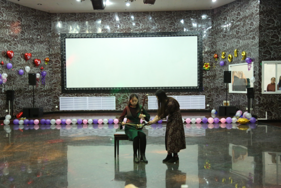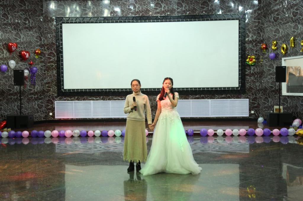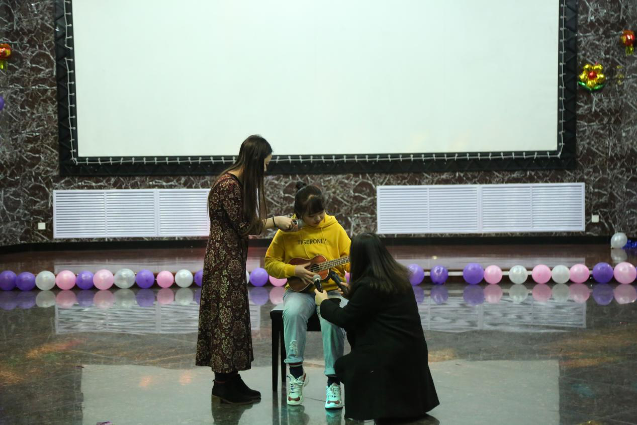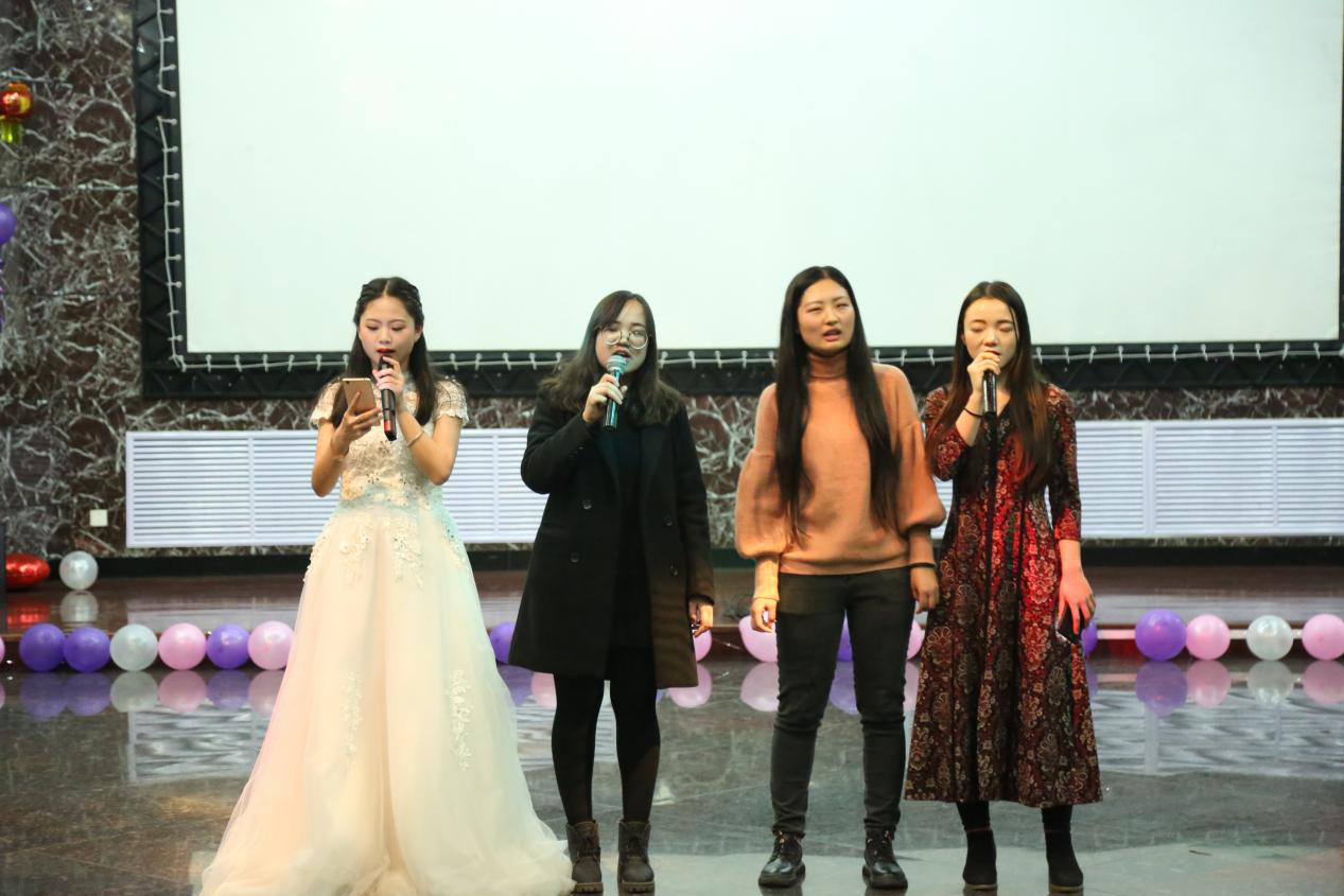 此次联谊晚会共有14个异彩纷呈的节目。这14个节目犹如万花筒一般,既有温婉甜美的女生歌唱,又有雄浑低沉的男性声音;既有声情并茂的诗歌朗诵,也有引人捧腹大笑的“三句半”表演;既有我国传统乐器二胡的深情款款,又有尤克里里传达出的轻松愉悦。而夏静院长为师生们献唱的《历史的天空》,在赢得了同学们的好评与热烈掌声的同时,更是将晚会推向了一个高潮。老师同学们准备的节目精彩不断,穿插在节目之间的互动小游戏也是充满欢乐,“传声筒”、“猜歌名”、“击鼓传花”三个互动小游戏,同学老师们积极参与其中。这几个小游戏,不但增强了会场的娱乐气氛,把欢乐传递给了在场的每个人,而且消除了同学与老师之间的距离感,使师生关系变得更为亲密融洽。最后,在一片祥和、欢乐的氛围中,所有老师同学上台合影留念,伴着《相亲相爱》的旋律,此次师生联谊晚会落下了帷幕。