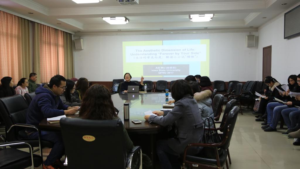 12月6日下午三点,蜘蛛体育直播官网 访问学者、美国爱荷华州立大学世界语言文学系终身教授穆爱莉在院二楼西会议室举办了题为“中国小小说的跨文化解读”的学术座谈会,座谈会由院长助理霍俊国主持。院长夏静教授、刘聪教授、张梅副教授等领导老师以及17级现当代文学、文艺学、汉语国际教育、比较文学等专业的研究生参加了本次学术座谈会。