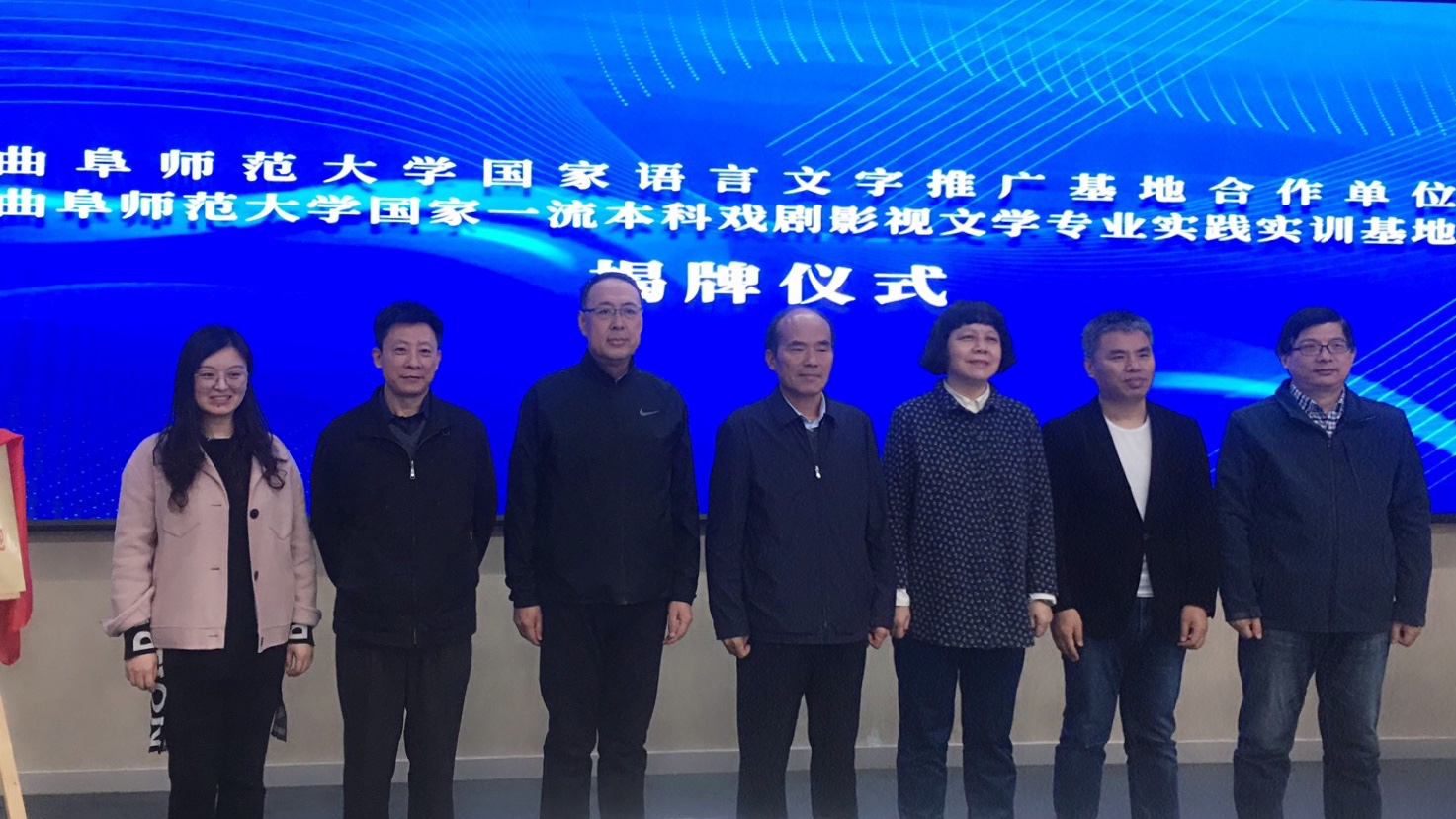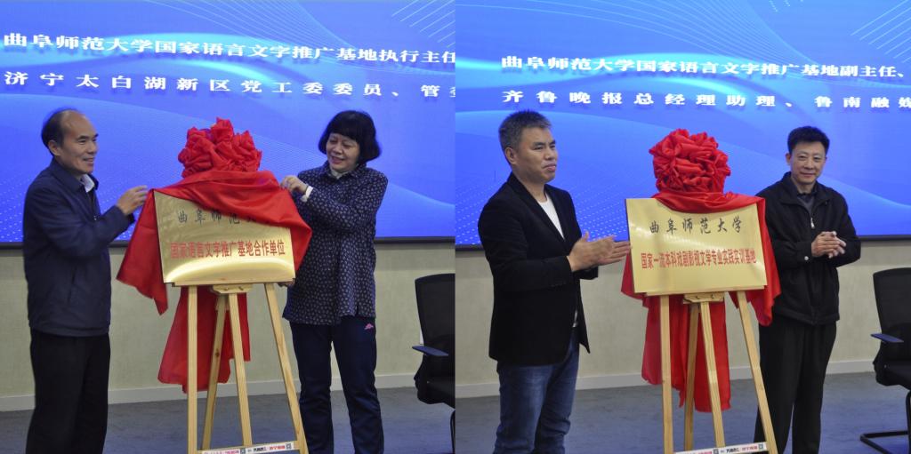 仪式上,夏静、张成俊共同为“曲阜师范大学国家语言文字推广基地合作单位”揭牌,杨新刚、马晓伟为“曲阜师范大学国家一流本科戏剧影视文学专业实践实训基地”揭牌。