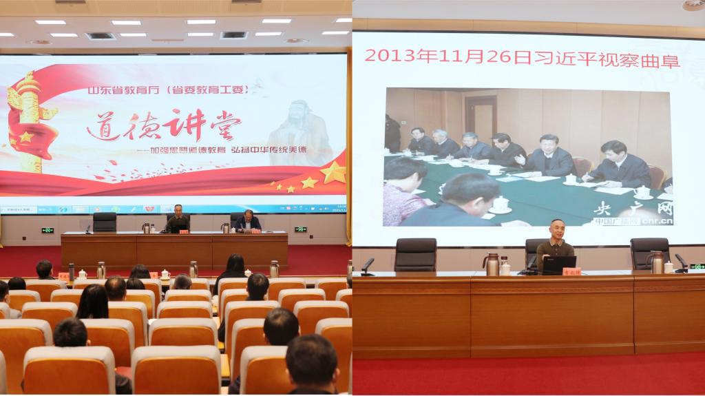 为全面贯彻落实习近平总书记关于“中华优秀传统文化是中华民族的精神命脉,是涵养社会主义核心价值观的重要源泉,也是我们在世界文化激荡中站稳脚跟的坚实根基。”重要讲话精神,进一步推进中华传统文化的普及与传承,在厅(委)机关营造传播向上向善正能量的良好氛围,我校副校长李兆祥教授接受山东省语言文字工作委员会邀请,于2021年11月10日在山东省教育厅做“中国文化自信的底气”专题报告,报告由山东省教育厅(副厅级)总督学刘欣堂主持,省教育厅部分同志及我校国家语言文字基地执行主任夏静教授、副主任李建校教授参加了此次报告。