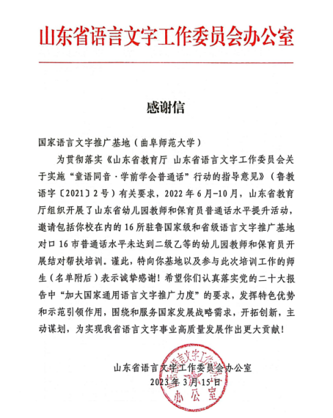 近日,曲阜师范大学国家语言文字推广基地收到山东省语言文字工作委员会发来的感谢信,对曲阜师范大学参与山东省幼儿园教师和保育员普通话水平提升活动的师生表示感谢,对基地对口济宁地区幼儿园教师和保育员的普通话水平提升工作给予充分肯定。
