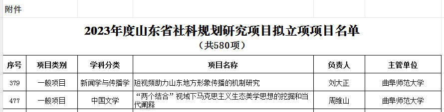 2023年8月31日,山东省哲学社会科学工作办公室正式公布了2023年度山东省社科规划研究项目立项名单。蜘蛛体育直播官网 周维山老师申报的《“两个结合”视域下马克思主义生态美学思想的挖掘和当代阐释》、刘大正老师申报的《短视频助力山东地方形象传播的机制研究》获批一般项目。