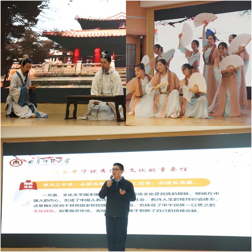 “赓续千年文脉,星耀复兴之路。”在传统文化板块中,领学人隋佳坤同学从传承中华优秀传统文化的重要性、我校对传统文化传承与弘扬的贡献、文化自信与中华民族伟大复兴等三方面带领同学们一起学习优秀传统文化。“三人行,必有我师焉。”中文剧社为同学们带来了话剧《我师》,讲述了孔子及其弟子的教育故事,深刻诠释了在人类历史发展的长河中,教师担任着承前启后、继往开来的光荣使命。《纸扇书生》以舞蹈的形式向同学们展现了“春华秋实路漫漫,一瓣心香巧耕耘。”
