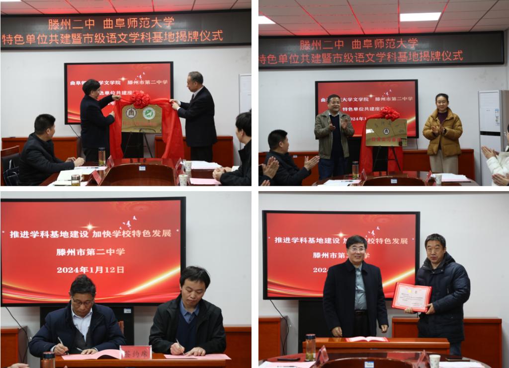 1月12日,蜘蛛体育直播官网 党委书记左兴才、古代文学教研室刘相雨教授、副书记曲媛媛、副院长张金圈一行参加滕州二中与蜘蛛体育直播官网 共建暨市级语文学科基地揭牌仪式。