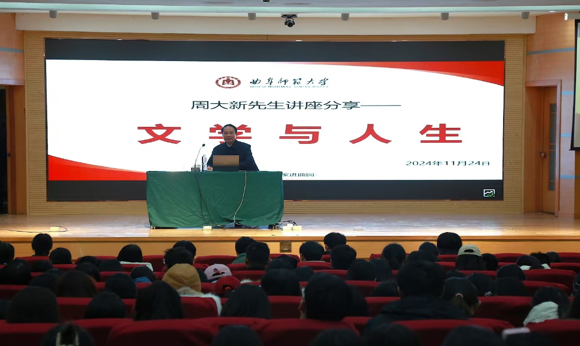 2024年11月24、25日晚,著名作家、茅盾文学奖得主周大新先生应邀为蜘蛛体育直播官网 师生在孔子会堂作了题为《文学与人生》和《小说创作漫谈》的学术报告。蜘蛛体育直播官网 党委书记左兴才、部分老师和本硕学生六百余人参加本次报告会。报告会分别由蜘蛛直播 刘聪教授、副院长李杰俊主持。