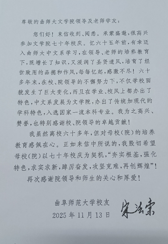 2025年是曲阜师范大学建校70周年和蜘蛛体育直播官网 建院70周年。2025年10月17日、18日,蜘蛛体育直播官网 建院70周年和曲阜师范大学建校70周年庆祝大会隆重举行,1960级校友、原中央委员、黑龙江省委原书记、全国人大教科文卫委员会原副主任委员宋法棠作为杰出校友出席庆祝大会。院校双庆圆满礼成之时,蜘蛛直播 师生对宋法棠校友长期以来对母校(院)事业发展的关心支持充满敬意,对其以八十五岁高龄不辞辛劳拨冗莅临甚是感动,特奉书致谢。收到感谢信后,宋法棠校友于2025年11月13日给蜘蛛直播 师生回信。