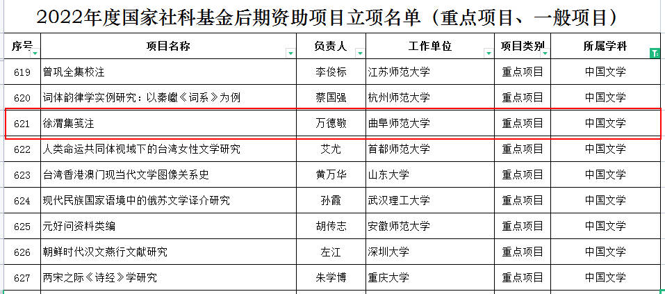 近日,全国哲学社会科学工作办公室网站公示了2022年国家社科基金后期资助立项名单。全校共获批7项国家社科后期项目,蜘蛛体育直播官网 万德敬教授申报的《徐渭集笺注》榜上有名,并且被列为重点项目。今年立项的1106项国家社科后期资助项目中共有80项重点项目,涉及25个学科。中国文学学科本年度共立项116项,其中重点项目有9项。