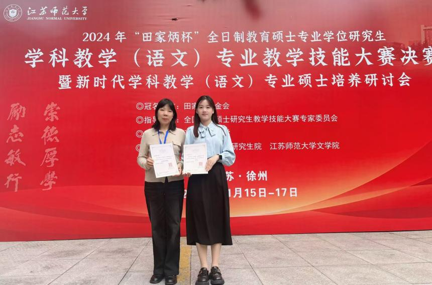11月15日至17日,2024年全国“田家炳杯”全日制教育硕士学科教学(语文)专业教学技能大赛决赛在江苏师范大学隆重举行,蜘蛛体育直播官网 2023级学科教学(语文)研究生于亚芳荣获二等奖,姜良存荣获“优秀指导教师”奖。